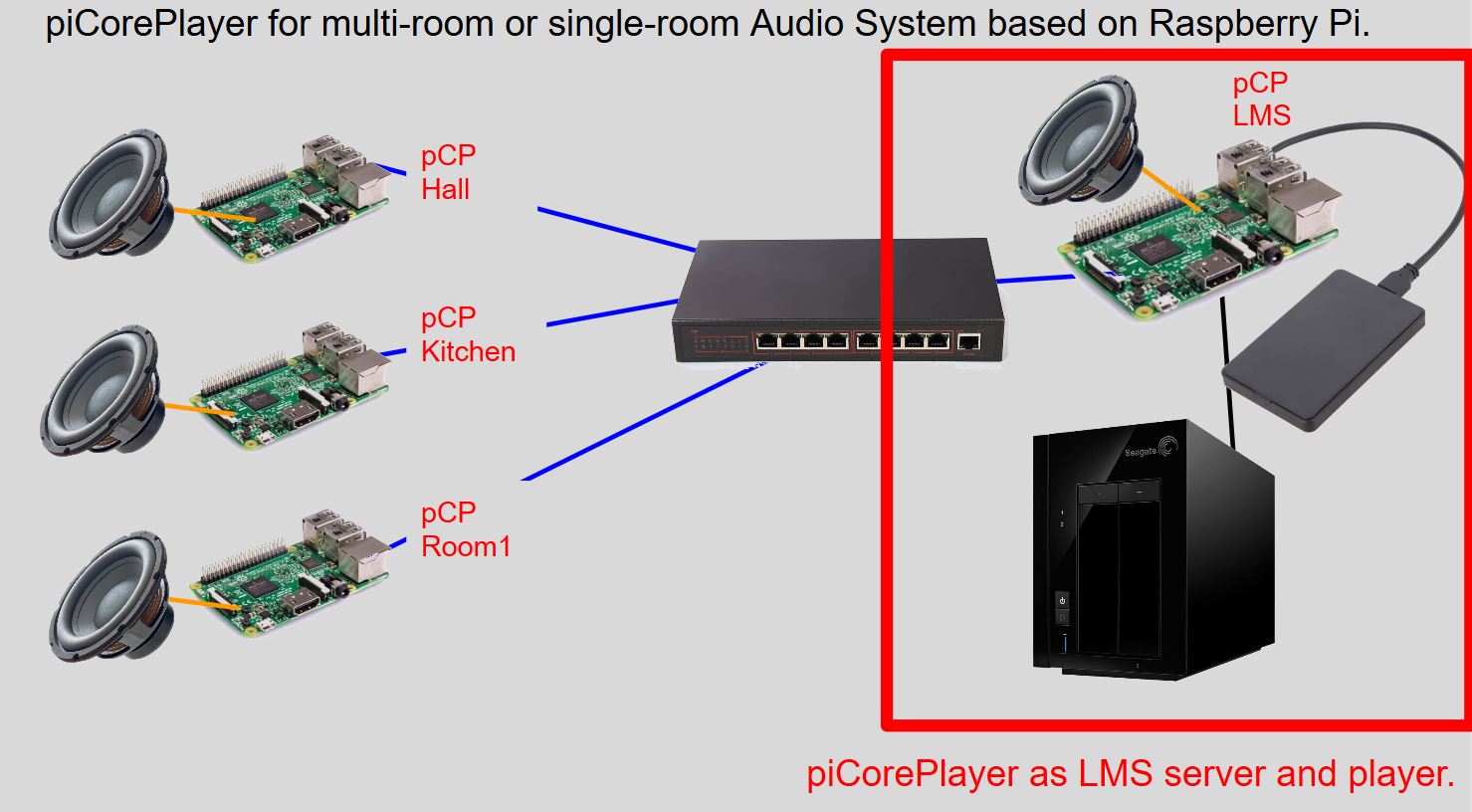 LMS (server) and Squeezelite (player) can be active on the same pCP unit. This creates a compact and complete audio system based on a RPi. To get the optimal experience we suggest to use the most powerful RPi.